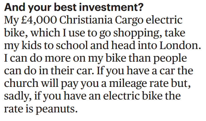He replied: “My £4,000 Christiania Cargobike, which I use to go shopping, take my kids to school and head into London. I can do more on my bike than people on their car”