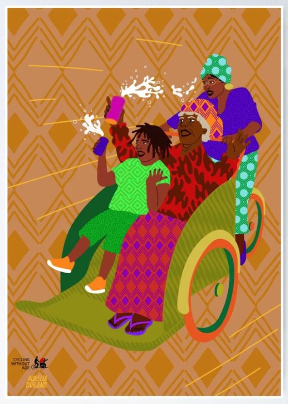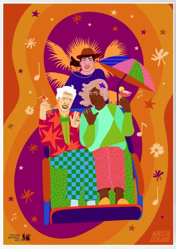 Cycling without Age has commissioned Aurelia Durand to paint a series of posters representing the wonderful world of volunteering by offering rides on a Christiania Bikes Model T.