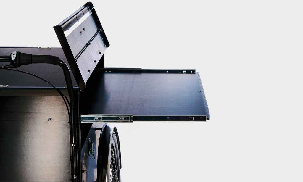 Model P can also be equipped with an Event box. This box consists of two tables and a long shelf. It is designed so that all the moving parts of the box are secured when the box is closed and the model is ridden. The Event box is supplied with two folding tables, display stand for brochures and a pull-out shelf and can be customized with various options and equipment.