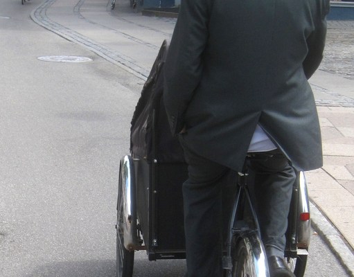 The Christiania tricycle is so easy to steer, that all you need is one finger. The back-pedal brake allows one to just use the right index finger on the handlebar. Naturally, if you are going downhill at speed, a steadier grip is needed. Photo by Copenhagen Cycle Chic.
